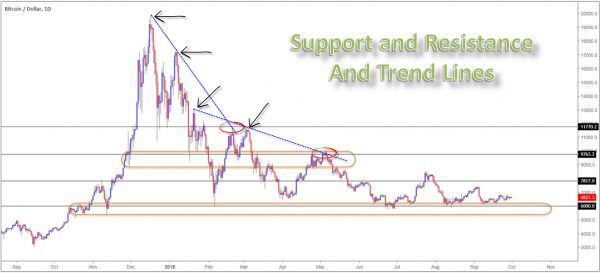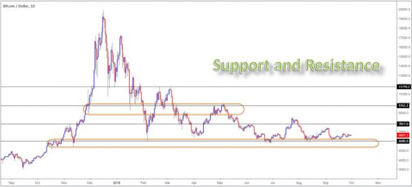 A support level denotes a ‘floor’ of a market, whereas a resistance level represents a ceiling. Note the $6000.0 mark on Bitcoin (also a psychological level) is a key barrier of support, rejecting price on a number of occasions in the past, and recently in August 2018. $7817.0 also established a point of resistance in the early stages of 2017, and has served the market as both support and resistance going forward.
