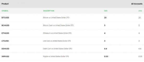 IC Markets offers 6 cryptocurrency CFDs, available to trade against the US dollar, including Bitcoin and Bitcoin cash. Below is a list of the associated ticker symbols along with minimum and average spreads: