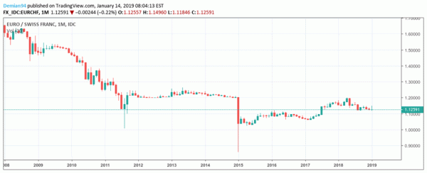 EUR/CHF monthly chart. As you can see, the long periods of relative stability are followed by sudden drops or increases in value.