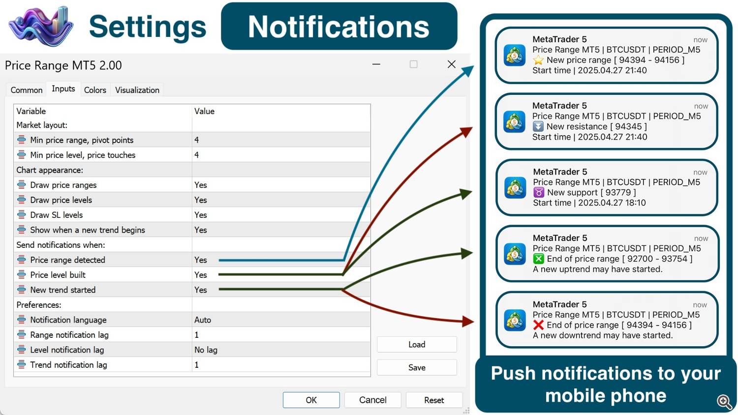 Don’t forget that the Price Range indicator has a very convenient, customizable notification system for new trends, support and resistance levels, and price ranges on any trading symbol and timeframe.